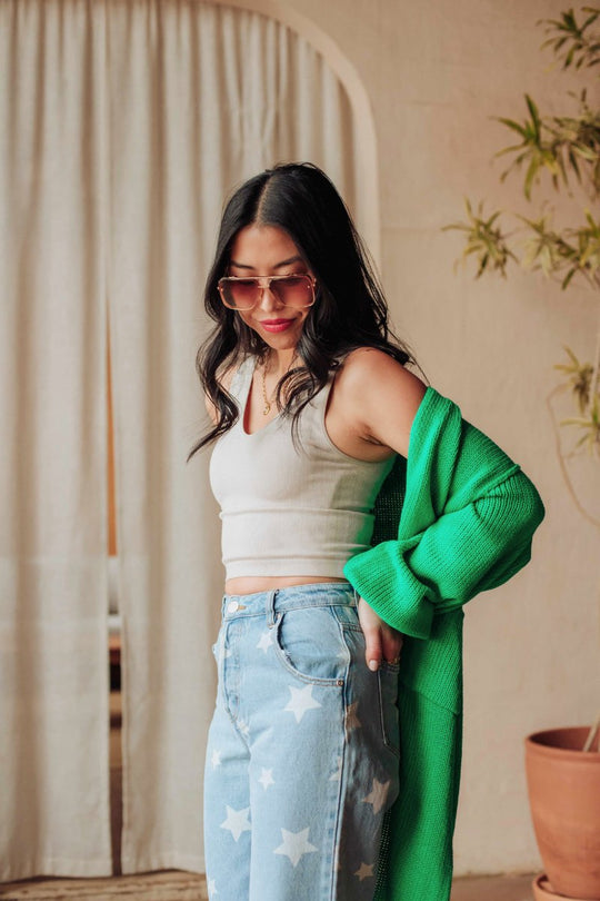 Chartreuse ribbed tank top White “God Bless Country Music” text on the front Sleeveless design Fitted silhouette Imported garment 46%...