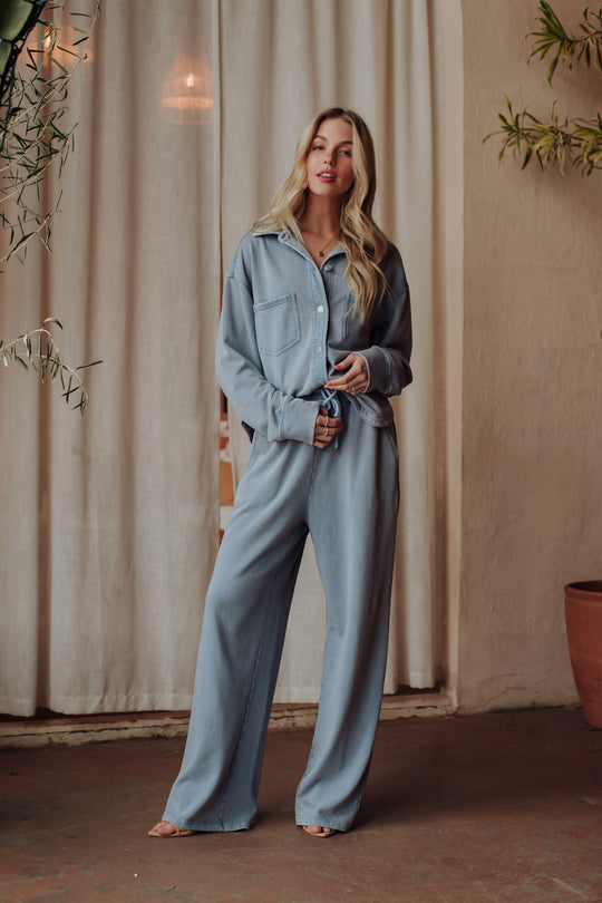 Loungewear with structure: button-up sets designed for real life. Light blue cropped washed soft button-up top Long sleeves Relaxed...