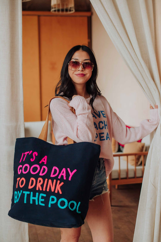 Bright blue tote Multicolored "It's a good day to drink on a boat" text on the front Pink pom tassel...