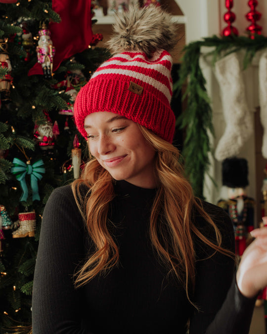 Green knit pom hat Pink "ho ho ho" text throughout Natural faux fur pom accent Cuffed hemline Fleece lined Crown...