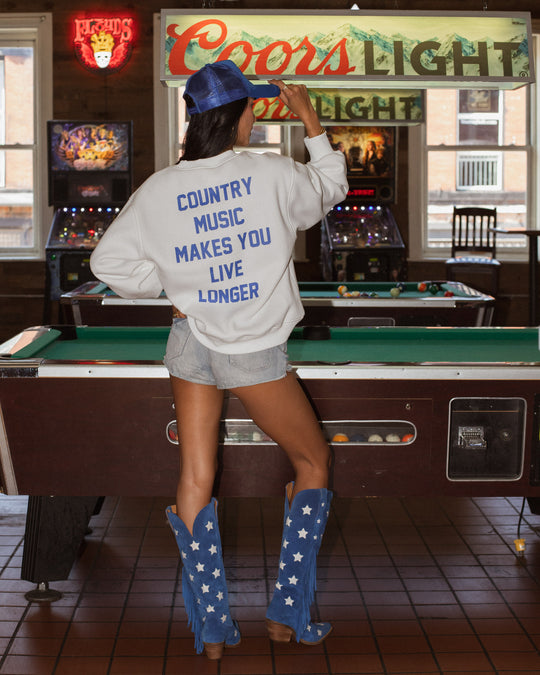 White ribbed tank top Blue “Country Music Makes You Live Longer” text on the front Crew neckline Cropped hemline Imported...