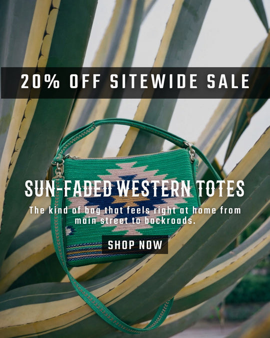 Southwestern-inspired carryalls, crossbodies, wristlets, and duffels with bold pattern, desert color, and just enough backroad attitude.
