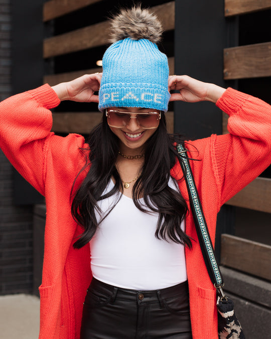 Green knit pom hat Pink "ho ho ho" text throughout Natural faux fur pom accent Cuffed hemline Fleece lined Crown...