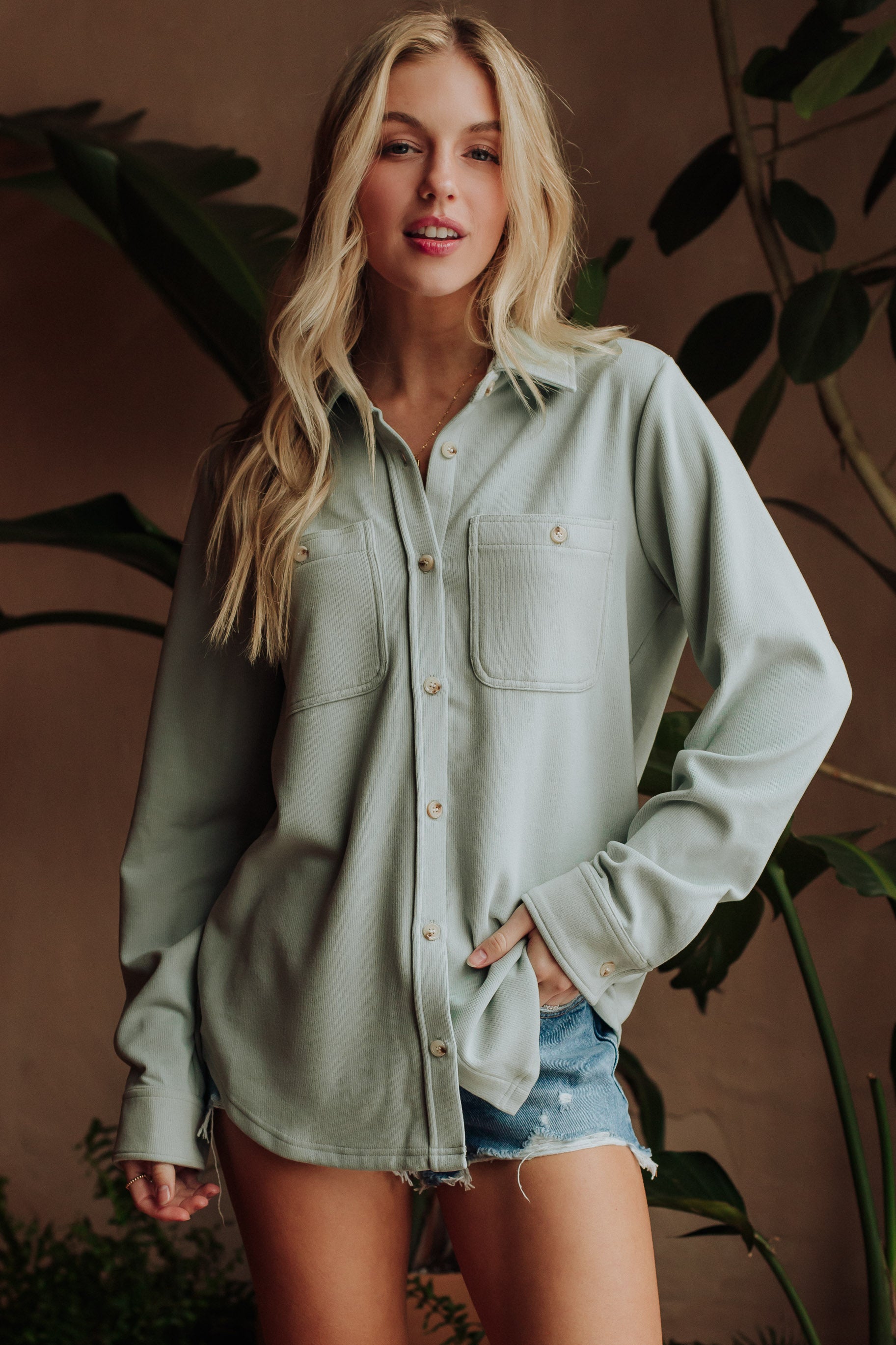 - Light blue soft button up top