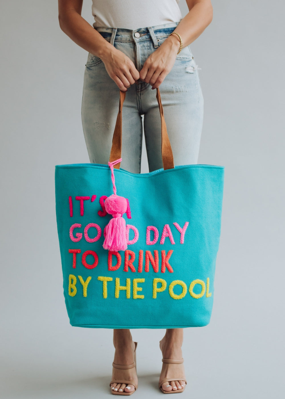- Multicolored "It's a good day to drink by the pool" text on the front