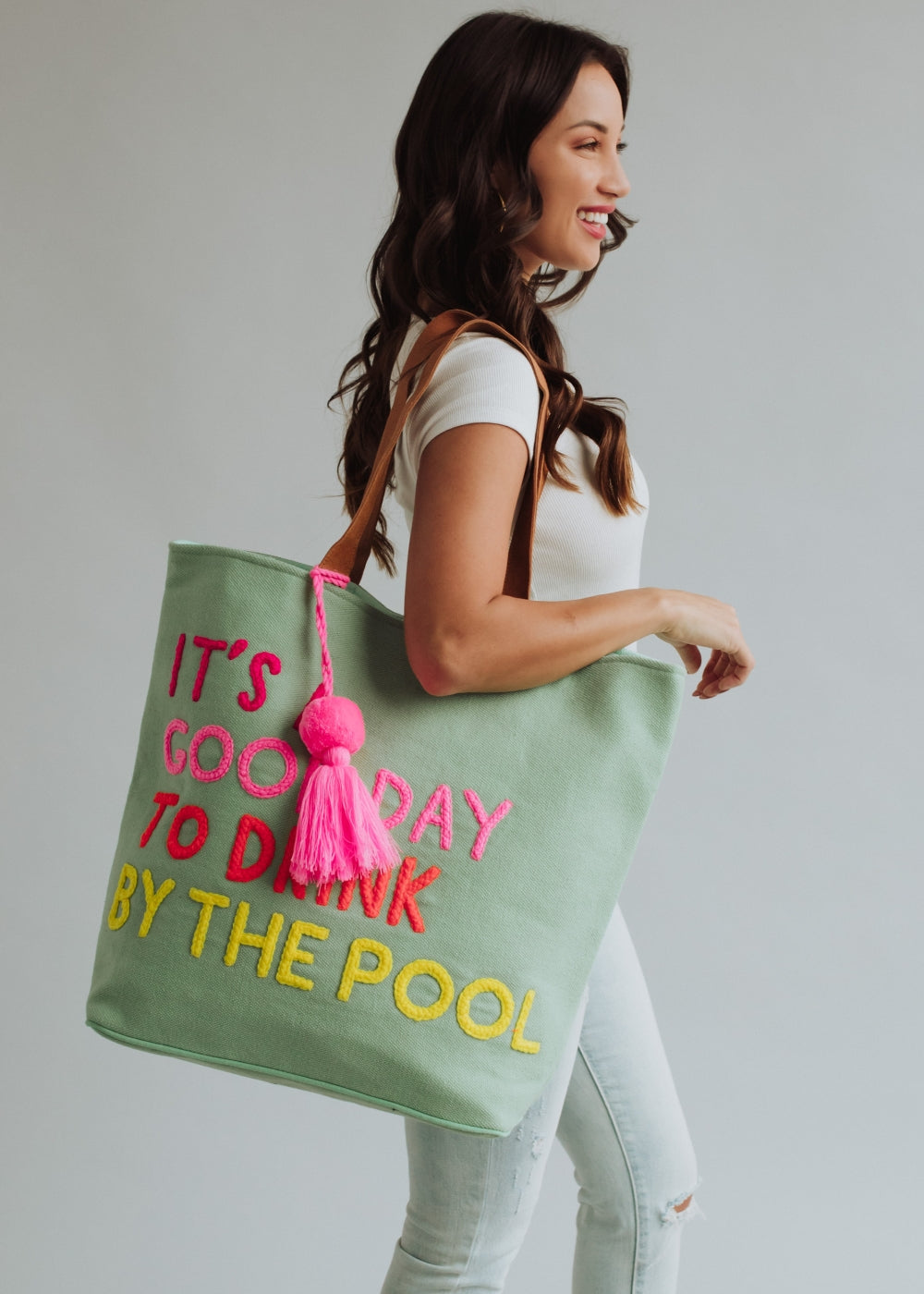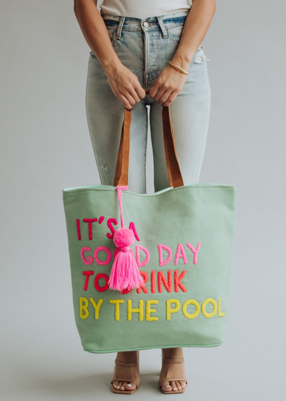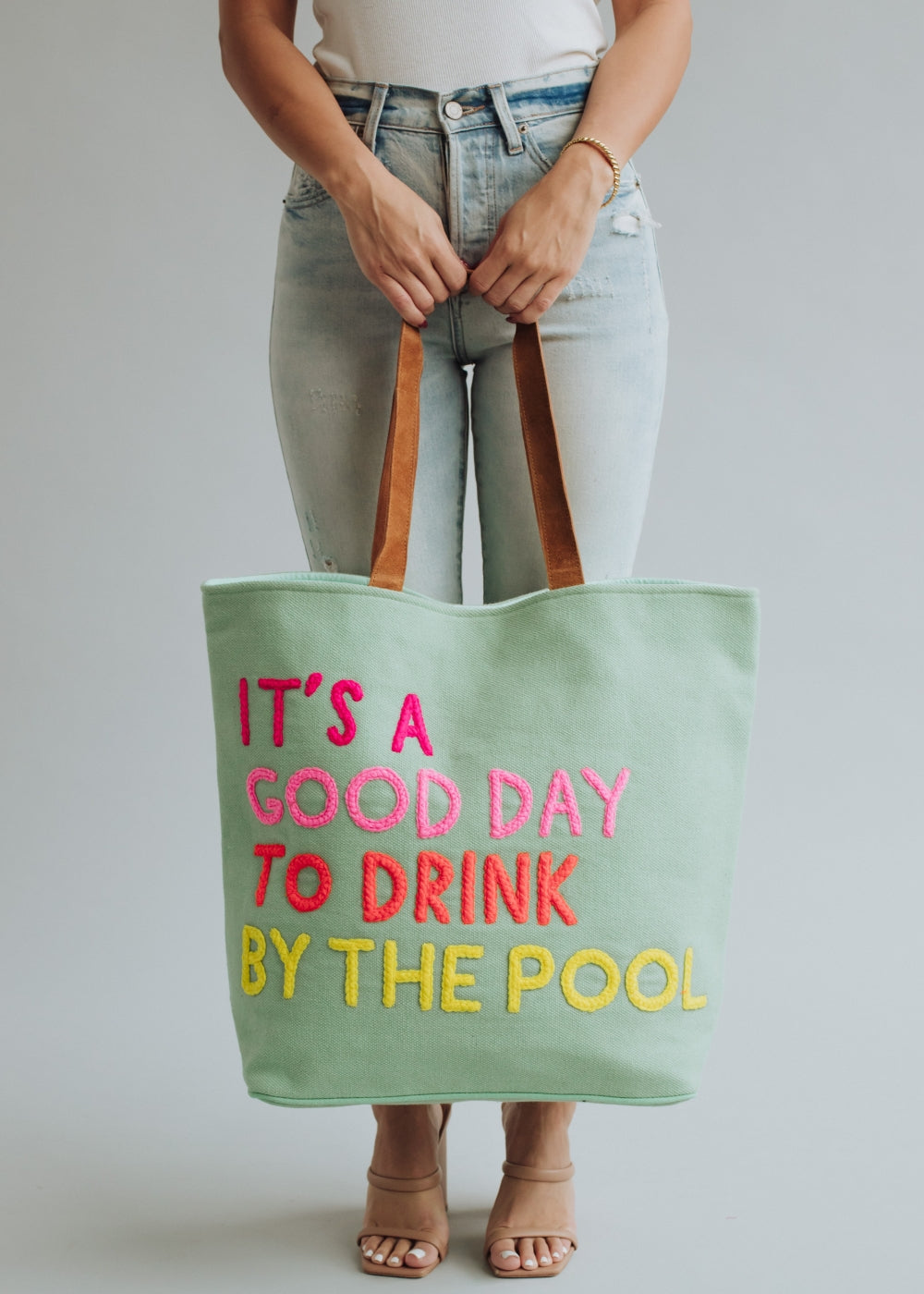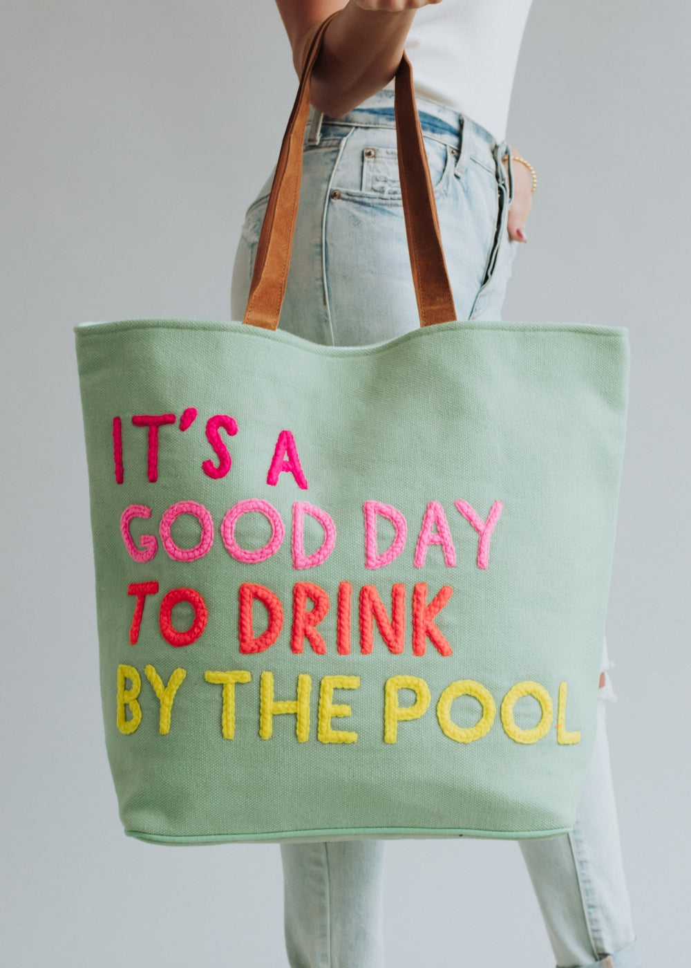 - Multicolored "It's a good day to drink by the pool" text on the front