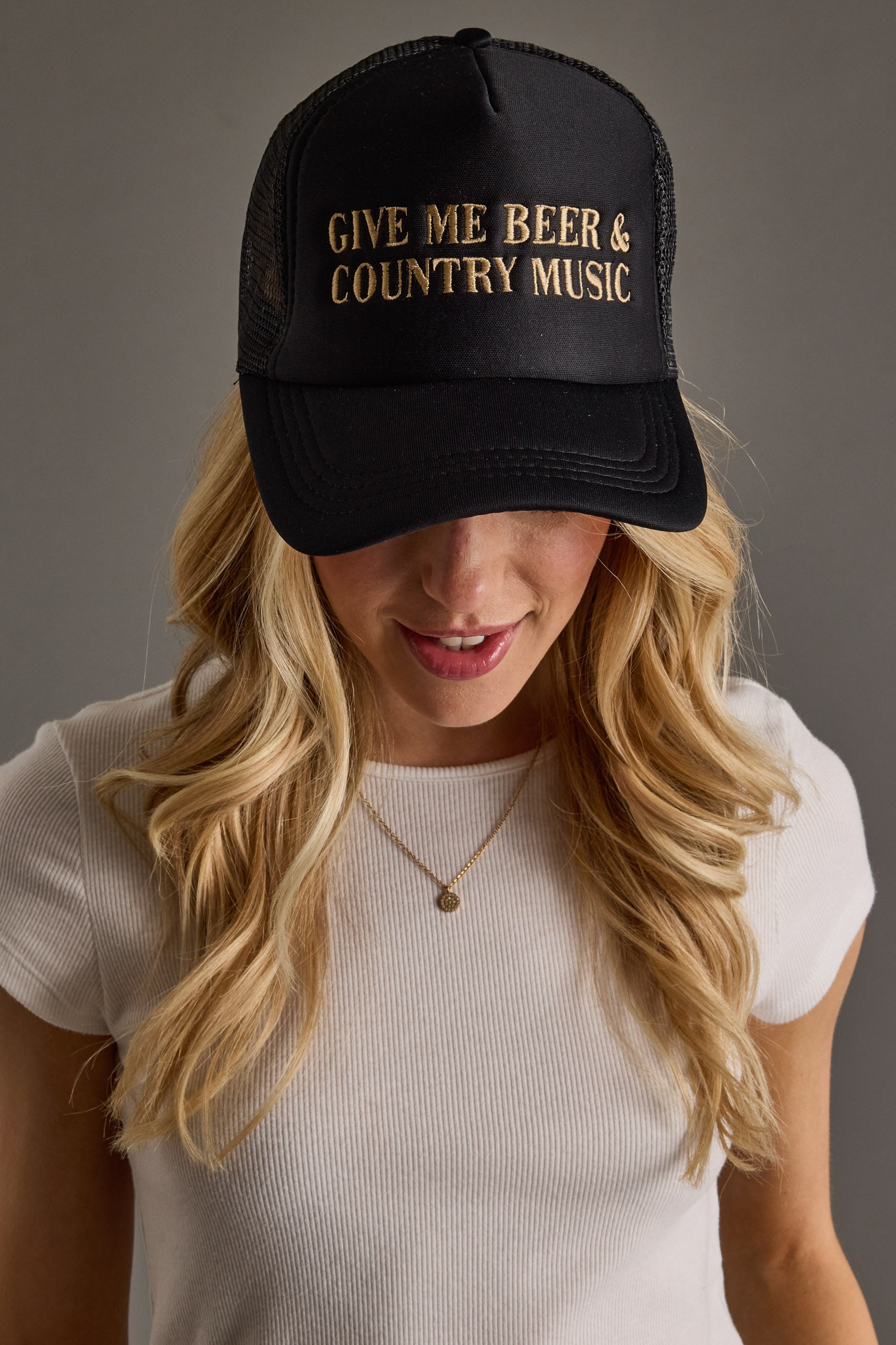- Tan “Give Me Beer & Country Music” embroidered text on the front