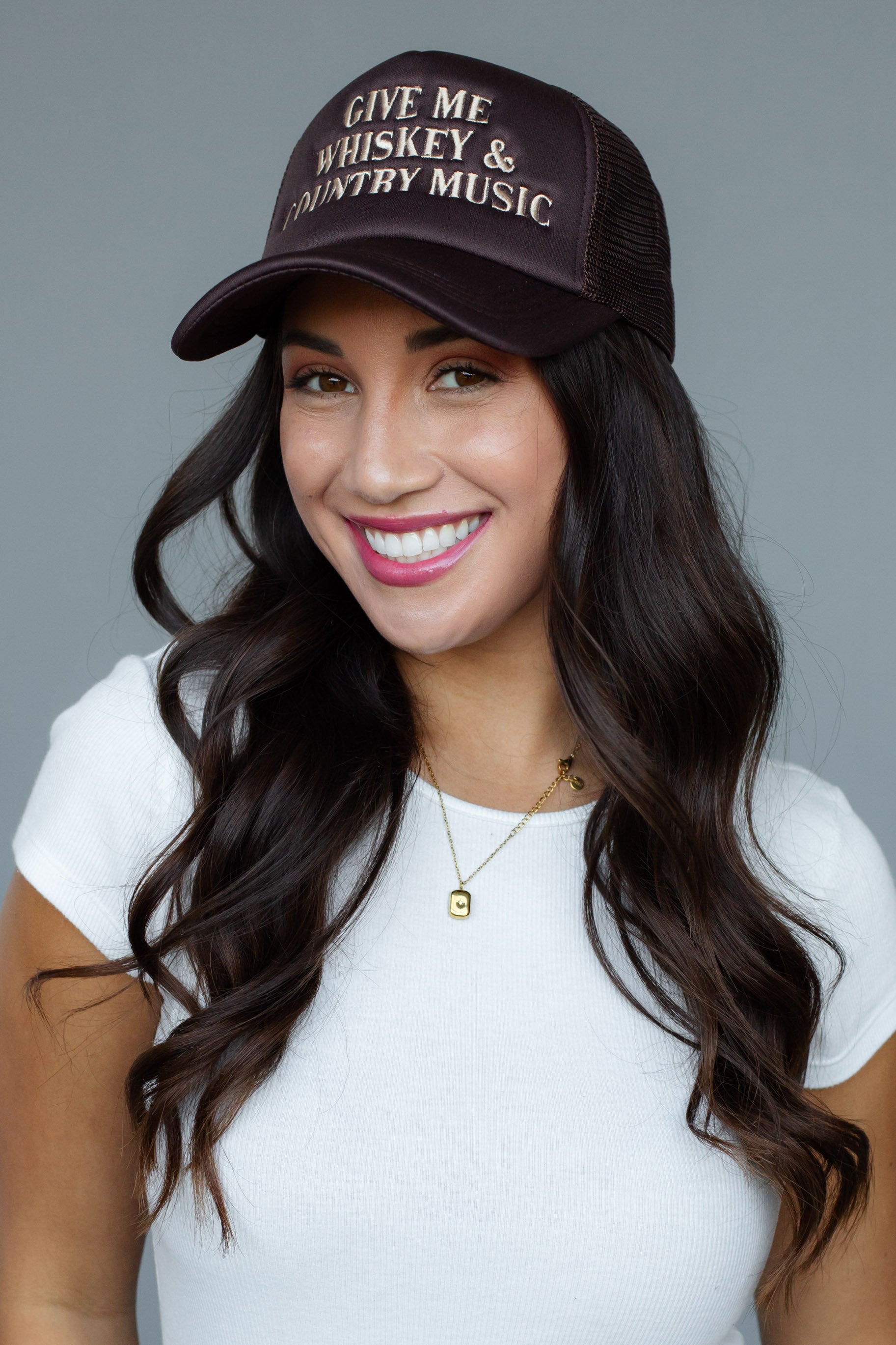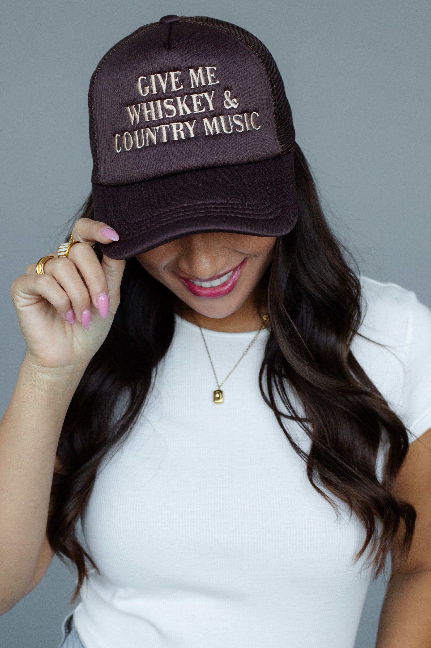 - Tan “Give Me Whiskey & Country Music” embroidered text on the front