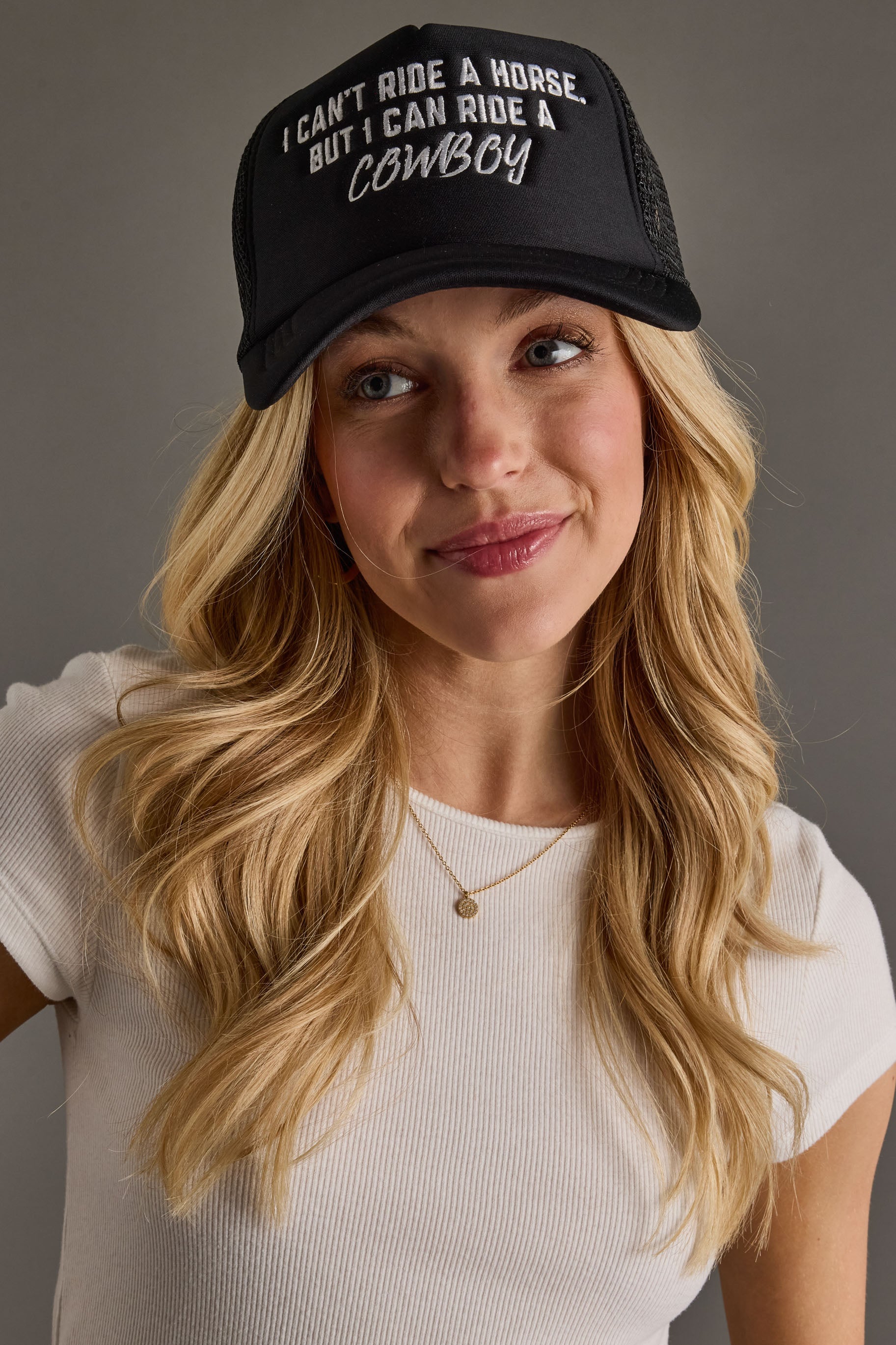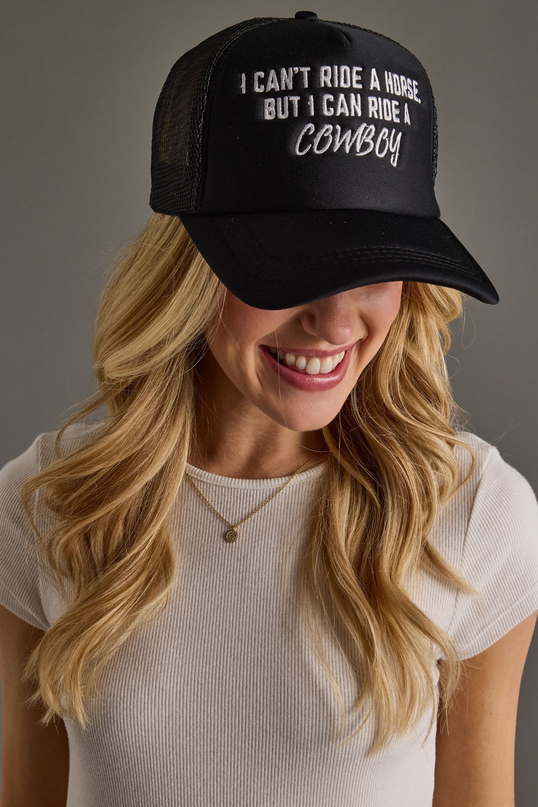 - White “I Can’t Ride A Horse But I Can Ride A Cowboy” embroidered text on the front