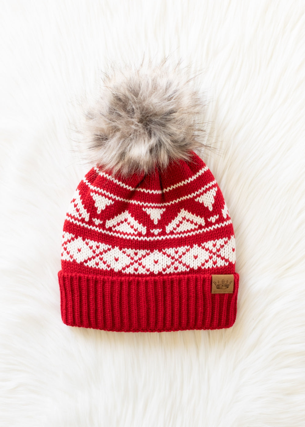 - Bright red knit pom hat