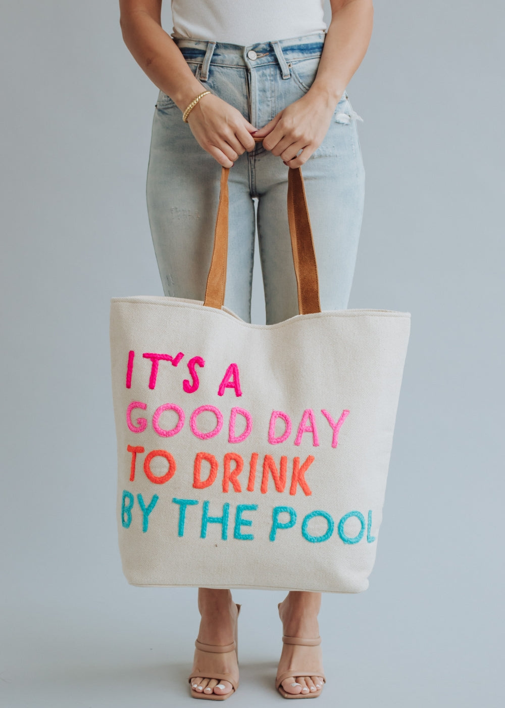 - Multicolored "It's a good day to drink by the pool" text on the front